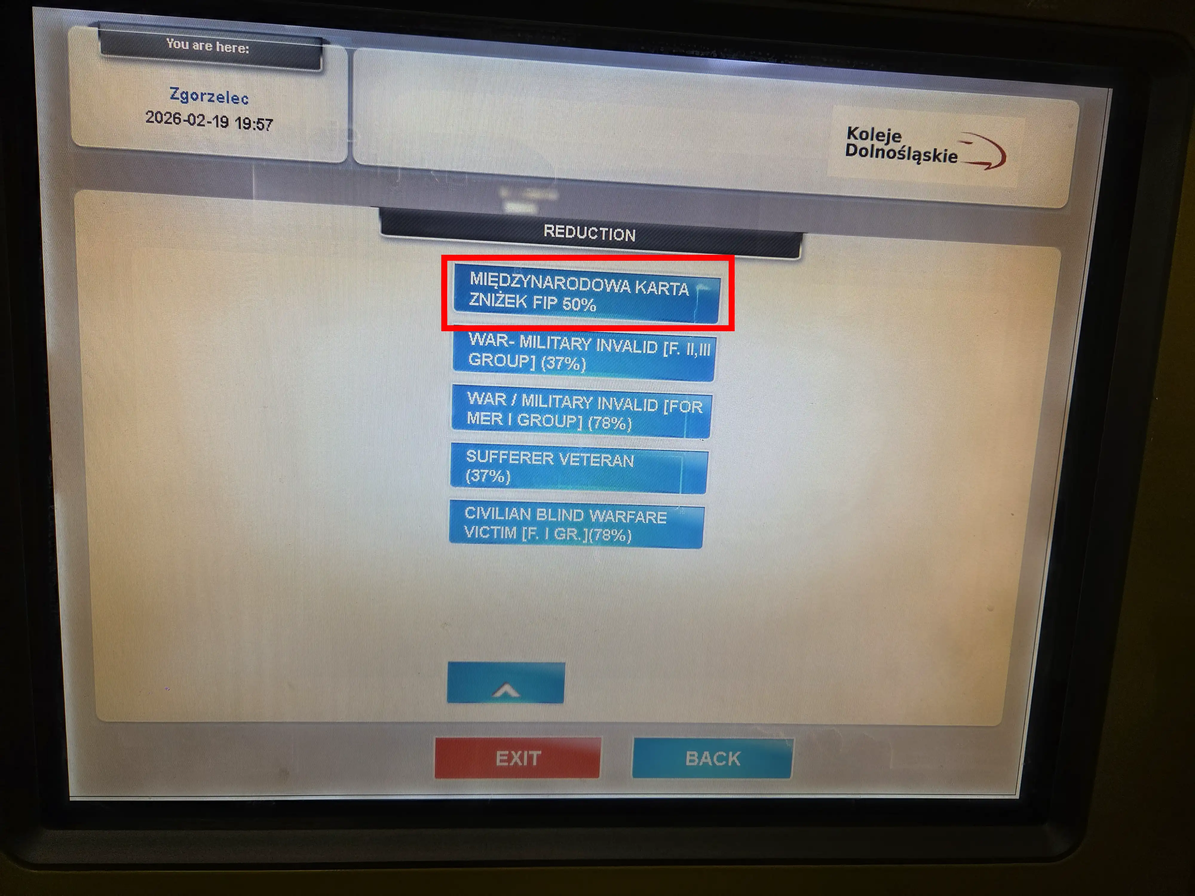 FIP 50 Fahrkarten können auch direkt im Zug erworben werden. Dafür muss direkt nach dem Einstieg das Zugbegleitpersonal aufgesucht werden. Bei Einstieg an Bahnhöfen, an denen auch ein Ticketschalter oder Fahrkartenautomat vorhanden ist, kann eine Gebühr für die Ausstellung im Zug zu dem Ticketpreis dazu kommen. Die Tickets können entweder bar oder mit kontaktloser Kreditkarte (Visa, Visa Electron, V Pay, Mastercard, Maestro) bezahlt werden.1 Eine Zahlung ist nur in der Landeswährung Złoty möglich.