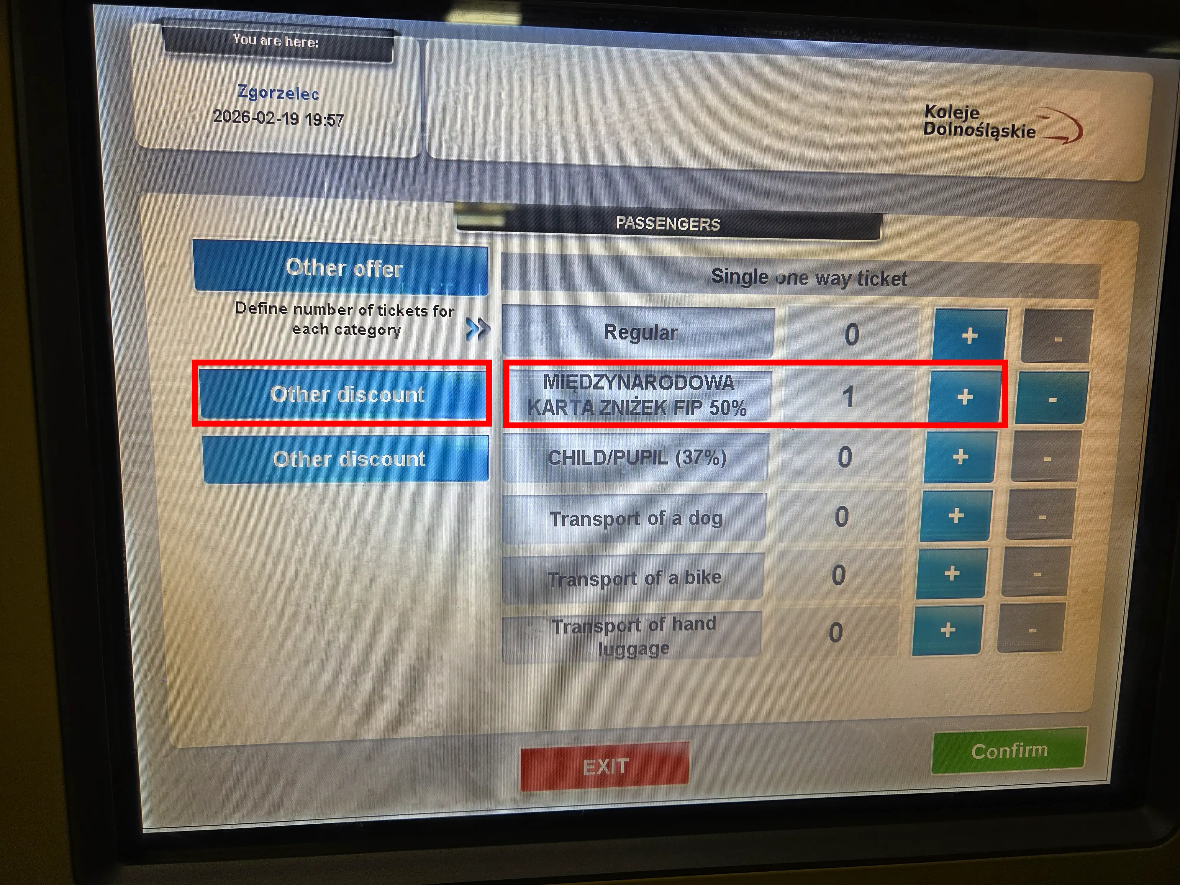 FIP-Vergünstigungen der KD gelten im Regelfall nur für die Abschnitte innerhalb von Polen. Eine Ausnahme stellen die grenzüberschreitenden Fahrten zwischen Polen und Deutschland auf dem Abschnitt Zgorzelec – Görlitz dar. Hier wird kein zusätzliches Ticket zwischen den beiden Bahnhöfen benötigt. Alle aus Polen kommenden bis Zgorzelec gültigen Tickets gelten auch bis zum Bahnhof Görlitz, andersrum genauso.