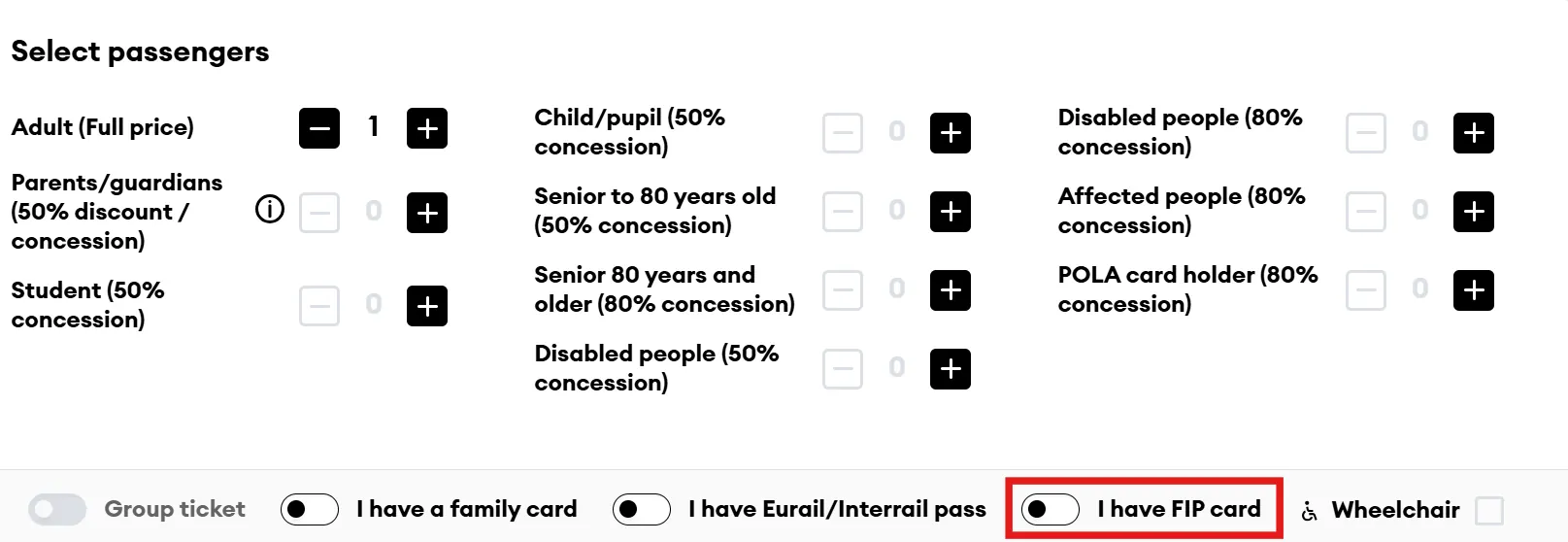 Bei allen Fahrten mit einem FIP Freifahrtschein muss vor jeder Fahrt ein kostenloses Ticket bzw. Reservierung erworben werden (siehe Zugkategorien und Reservierungen).